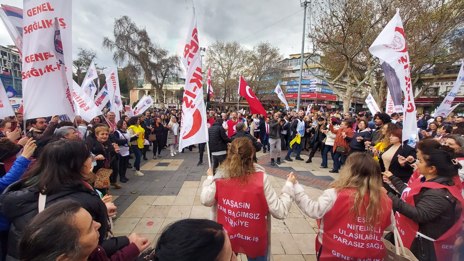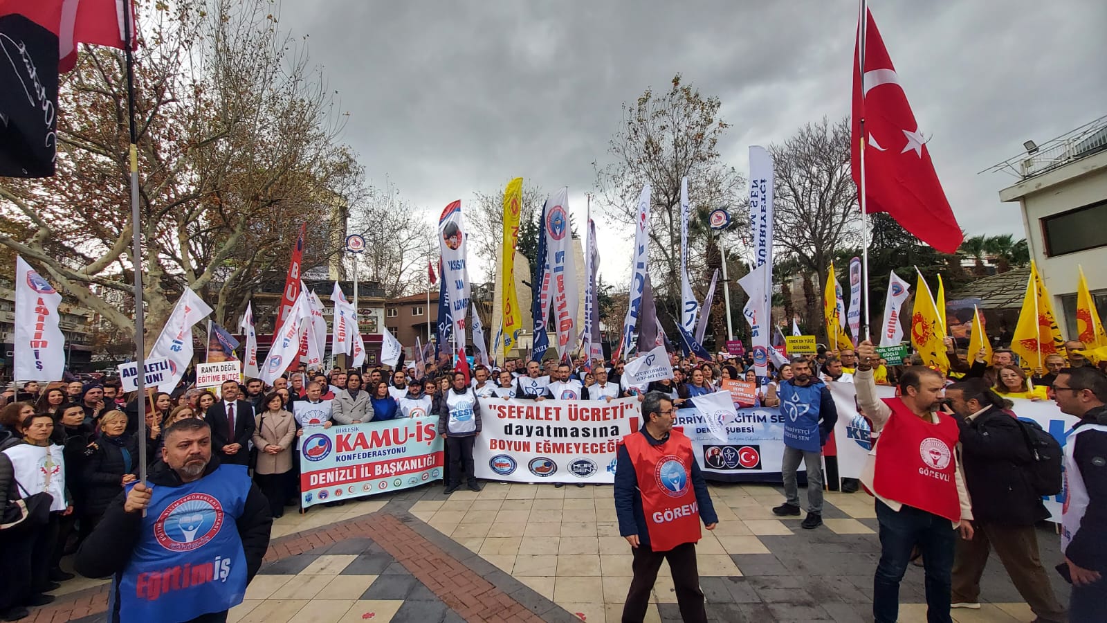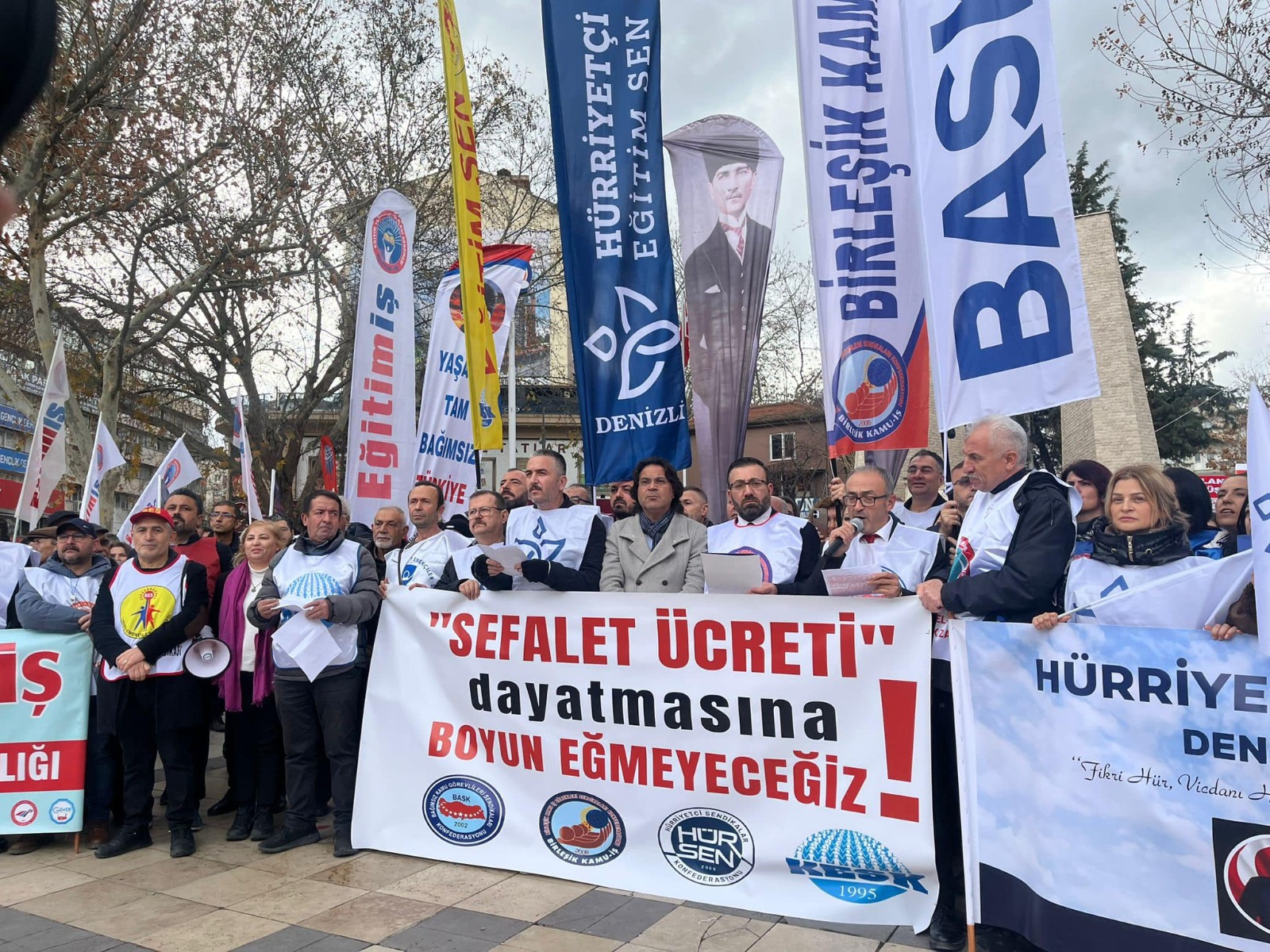 Maaşlar Mum Gibi EriyorMeydana toplanan kalabalık adına yapılan basın açıklamasında, ekonomik kriz ve düşük maaş artışlarına tepkiler dile getirildi. BASK Denizli Temsilcisi Yaşar Kurun, BİRLEŞİK KAMU-İŞ Denizli Temsilcisi Tahir Çetin, Hür-Sen Denizli Temsilcisi Ersin Dede ve KESK Denizli Temsilcisi Selçuk Göçer’in bir araya gelerek yaptığı ortak açıklamada şu ifadelere yer verildi:“Alım gücümüz düşüyor, maaşlarımız mum gibi eriyor. En temel ihtiyaçlarımızı karşılamakta zorlanıyoruz. 2025 yılına, yüzde 30’luk asgari ücret zammı ve memur maaşlarında yapılan yüzde 11,54 oranındaki sefalet artışı ile girdik. Vergi ve harçlara yüzde 44 zam yapılırken, ödediğimiz KDV ve ÖTV oranlarında şu an bile fahiş artışlar var. Bu adaletsiz düzeni kınıyoruz.”