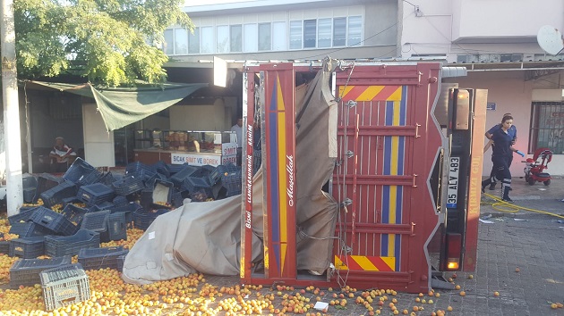 Aydın’ın Efeler ilçesinde meydana gelen kazada, kayısı yüklü kamyon devrilirken, kazada 3 kişi yaralandı.