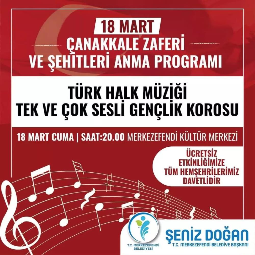 Merkezefendi Belediyesi, kültür ve sanat etkinliklerine devam ediyor. Bu kapsamda Çanakkale Zaferi'nin 107. yıl dönümüne özel Merkezefendi Belediyesi Türk Halk Müziği Tek ve Çok Sesli Gençlik Korosu Zühal Feray Şenkibar şefliğinde ilk kez konser verecek.