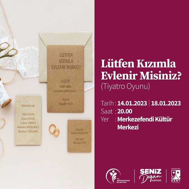 14 Ocak Cumartesi ve 18 Ocak Çarşamba günü saat 20.00’de Muzaffer İzgü’nün kaleme aldığı ‘Lütfen Kızımla Evlenir Misiniz?’ isimli tiyatro oyunu seyirci ile buluşacak.
