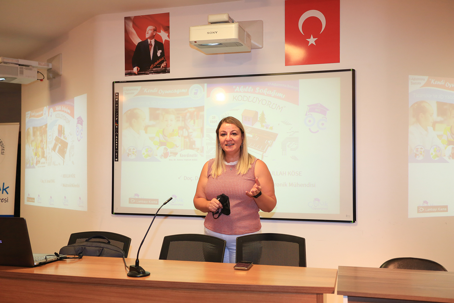 Törende konuşma yapan Doç. Dr. Fatma Taşkın Ekici, eğitime katılan çocukların işleyişi ve uygulamaları adım adım öğrendiklerini hatırlatırken, öğrencilerin tasarımdan montaja her aşamada aktif rol aldıklarını, böylece çocukların özgüvenlerinin arttığını dile getirdi.