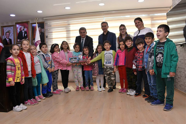 Acıpayam Mehmet Manisalı Anaokulu Müdürü Mahmut Sabancı, öğretmen Belgin Karkın Esen ve stajer öğrenci Gülçin Molo’nunda hazır bulunduğu ziyarette minik öğrenciler üzerinde Başkan amcalarının da resmi olan tasarımı hediye ettiler.Başkan Şevkan’ın resmi ve okul gecesinde çekilen hatıra fotoğrafının olduğu tasarımı hediye eden öğrencilerin ziyaretinden duyduğu memnuniyeti dile getiren Başkan Şevkan , sürpriz hediye için de minik öğrencilere teşekkür etti.