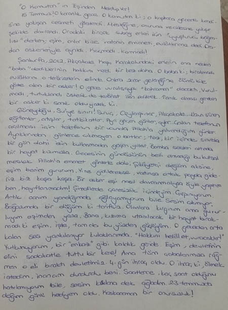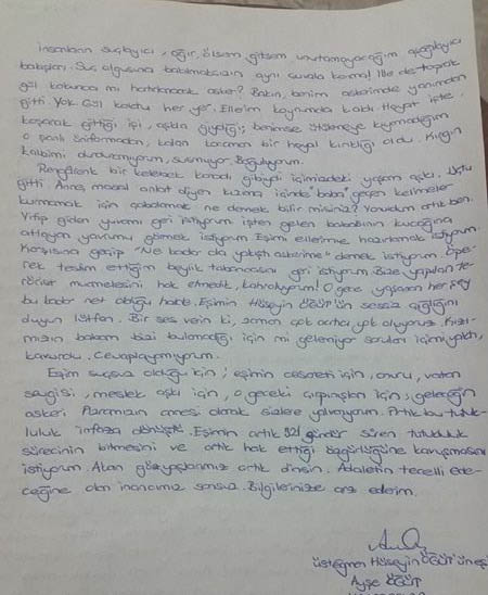 Denizli’de 15 Temmuz darbe girişiminin yaşandığı gece komutanına silah çeken Üsteğmen Hüseyin Öğüt, o geceden sonra tutuklanırken, FETÖ/PDY operasyonları kapsamında Türk Silahlı Kuvvetlerinden ihraç edildi. Üsteğmen Hüseyin Öğüt’ün eşi Ayşe Öğüt ise vatanı uğruna canını vermeye hazır olan eşinin görevini yerine getirirken yaşadıklarını, vatanını, devletini ne kadar çok sevdiğini, o gece yine devletini korumak isterken devletin onu yok saydığını ve yaşadıklarını satırlara döktü.VURULSAYDI KAHRAMAN OLACAKTIDarbe gecesi eşinin vatanımın emaneti dediği askerlerini koruduğunu, darbecilerle bir olmak yerine onların karşısında dikildiğini belirten Ayşe Öğüt, emrindeki askerleri teröristlerin eline bırakmayan eşim o gece vurulsaydı kahraman ilan edilecekti. Onun yerine terörist ilan edilerek tutuklandı dedi.İŞTE O MEKTUPÜsteğmen Hüseyin Öğüt’ün eşi Ayşe Öğüt mektubunda şu sözlere yer verdi;“15 Temmuz! O karanlık gece. O komutan ki; o kapkara gecede kendisine yakışan cesareti gösterdi. Mesleğine, ailesine ve onuruna yakışır şekilde davrandı. Oradaki bir çok Subay erleri için “uyuşturucu bağımlısı” derken; eşim onlar bize vatanın emaneti, evlatlarımız dedi. Oradan askerleriyle ayrıldı. Kaçmadı, korkmadı!Şanlıurfa, 2012. Akçakale Kapı Karakolundaki erlerin O’na neden “baba” dediklerinin hakkını verdi bir kez daha. O baba ki; bırakmadı evlatlarını o teröristlerin elinde. Onlara zarar geleceğine ölümü bile göze alan bir asker! O gece vurulsaydı “kahraman” olacaktı. Vurulmadı, tutuklandı. Üstelikte terörist ilan edilerek. Tanık olması gereken bir asker ki, sanık oldu ne yazık ki.Güneydoğu, Suriye sınırı! Suruç, Ceylanpınar, Akçakale… Uzun süren eğitimler, atışlar, tatbikatlar. Ayrı geçen günler, aylar… Çalan telefonun açılması için telefonun bir ucunda Allah’a yalvardığım günler. Ayaklarından günlerce çıkmayan o botlar, toz, kir içinde sınırda bir gün dahi izin kullanmadan geçen yıllar. Bomba sesleri altında bir hayat kızımızla. Gecesinin gündüzünün belli olmadığı bu kutsal meslek Allah’a emanet günlerle dolu. Şikayetçi değilim aksine eşim benim gururum. Yine gidilecekse, vatansa ortak payda gideriz biz koşa koşa. Bir asker eşi nasıl davranmalıysa öyle yaptım ben, hayıflanmadım! Şimdilerde çaresizlik içindeyim. Çırpınıyorum. Artık canım yandığında ağlayamıyorum bile sesim çıkmıyor. Boğazımda bir düğüm ki tarifsiz. Olanlara kırgınım ama gururluyum eşimden yana. Bana, kızıma utanılacak bir hayat bırakmadı ki eşim. İşte tam da bu yüzden güçlüyüm. O geceden arda kalan ses yankılanıyor kulaklarımda. “Hakkını helal et, vuracaklar!” Yutkunuyorum bir enkaz gibi kaldık geride. Eşim, devletinin elini sadakatle tuttu bir kere! Ama tüm çabalarımıza rağmen o eli bıraktı devletimiz. 4. Gün ihraç oldu. O ihraç ki, ölmek istedim, inancım durdurdu beni. Saatlerce, saat kaç olduğunu hatırlamıyorum bile sesim kısılana dek ağladım. 23 Temmuz’da doğum günü hediyem oldu. Koskocaman bir onursuzluk!İnsanların suçlayıcı, ağır, ölsem unutamayacağım aşağılayıcı bakışları. Suç algısına bakılmaksızın aynı çuvala koma! İlle de toprak gül kokunca mı hatırlanacak asker? Bakın, benim askerimde yanımdan gitti. Yok. Gül koktu her yer. Ellerim koynumda kaldı. Hayat işte, koşarak gittiği işi, aşkla gittiği; benimse ütülemeye kıyamadığım o şanlı üniformadan kalan kocaman bir hayal kırıklığı oldu. Kırgın kalbimi durduramıyorum, susmuyor, boğuluyorum.Rengarenk bir kelebek kanadı gibiydi içimizdeki yaşam aşkı. Uçtu gitti. Anne masal anlat diyen kızıma içinde baba geçen kelimeler kurmamak için çabalamak ne demek bilir misiniz? Yoruldum artık ben. Yitip giden yuvamı geri istiyorum. İşten gelen babasının kucağına atlayan yavrumu görmek istiyorum. Eşim ellerimle hazırlamak istiyorum. Öperek teslim ettiğim beylik tabancasını geri istiyorum. Bize yapılan terörist muamelesini hak etmedik, kahroluyorum! O gece yaşanan her şey bu kadar net olduğu halde, eşimin HÜSEYİN ÖĞÜT’ün sessiz çığlığını duyun lütfen. Bir ses verin ki, zaman çok acıtıcı yok oluyoruz. Kızımızın babam bizi bulamadığı için gelemiyor soruları içimi yaktı, kavurdu. Cevaplayamıyorum.Eşim suçsuz olduğu için; eşimin cesareti için, onuru, vatan sevgisi, meslek aşkı için, o geceki çırpınışları için; geleceğin askeri annesi olarak sizlere yalvarıyorum. Artık bu tutukluluk infaza dönüştü. Eşimin artık tutukluluk sürecinin bitmesini ve hak ettiği özgürlüğe kavuşmasını istiyorum. Akan gözyaşlarımız artık dinsin. Adaletin tecelli edeceğine olan inancımız sonsuz.”.jpg)
