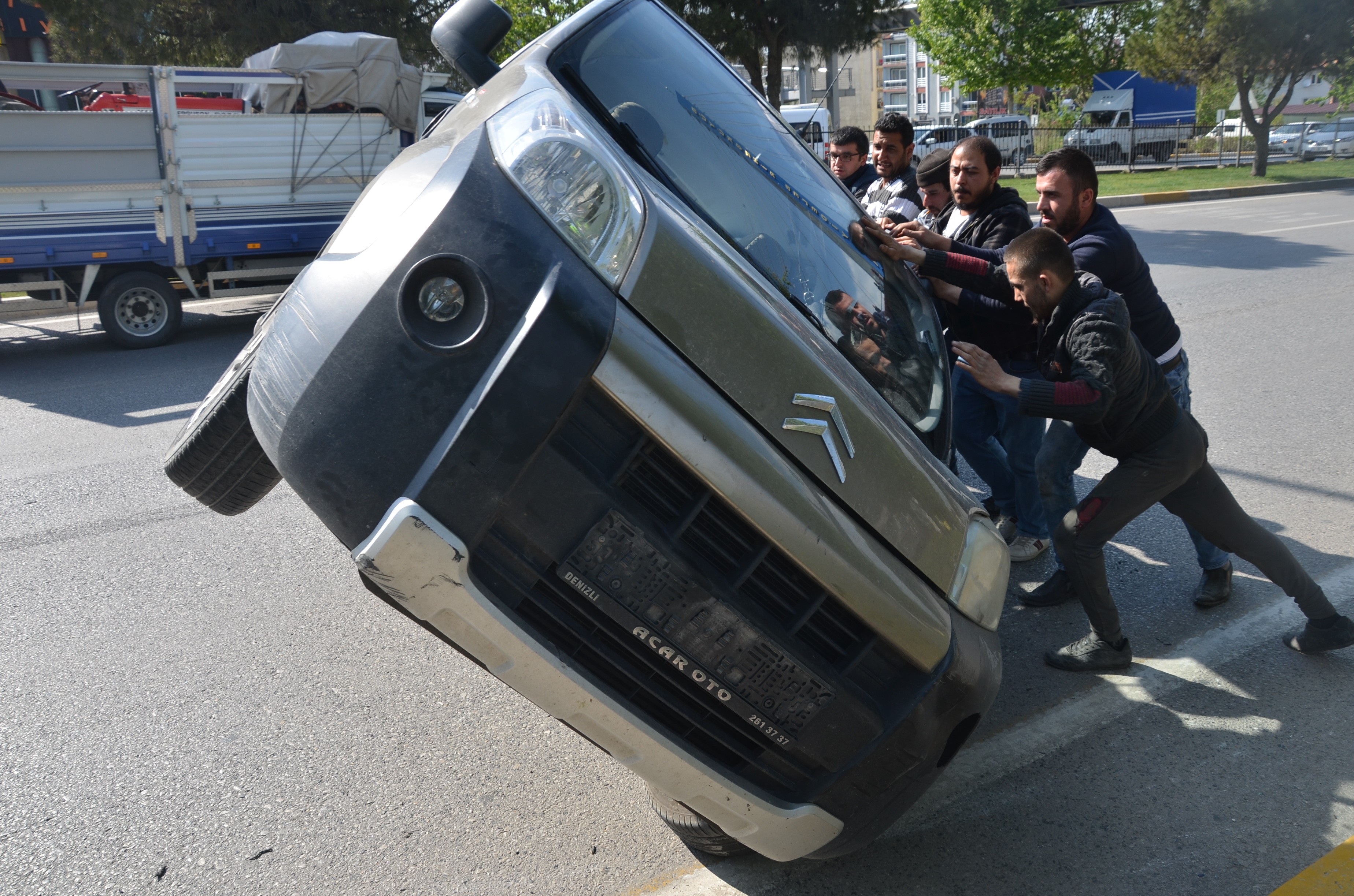 Edinilen bilgiye göre, Pamukkale ilçesi Fevzi Çakmak Bulvarı üzerinde ilerleyen Hüseyin D. idaresindeki 20 Y 4010 plakalı ticari araç, sürücüsünün direksiyon hakimiyetini kaybetmesi sonucu kontrolden çıkarak önünde seyir halinde olan Ufuk A.’nın kullandığı 45 ZE 442 plakalı otomobile çarptı. Çarpmanın etkisiyle savrulan ticari araç, yan yatarak yaklaşık 50 metre sürüklendi. Kaza sonrası çevredekilerin haber vermesi ile olay yerine polis ve 112 acil servis ekipleri sevk edildi. Sağlık ekipleri kendi imkanlarıyla yan yatan araçtan yaralı olarak çıkan sürücü Hüseyin D. ile Suriye uyruklu olduğu öğrenilen 2 kişiyi ambulansla Pamukkale Üniversitesi ve Denizli Devlet Hastanesine kaldırdı.