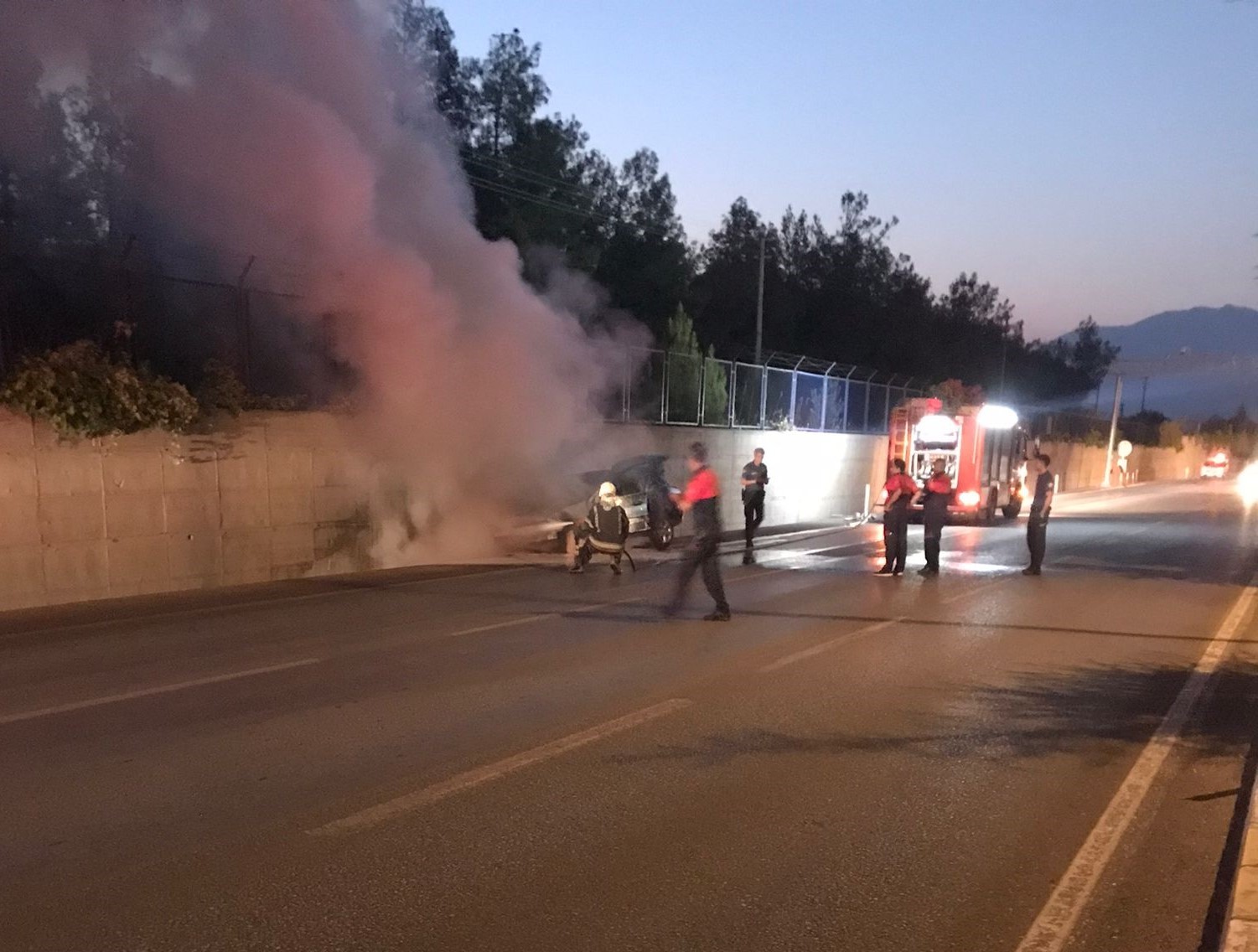 Denizli’de seyir halindeyken dumanların yükseldiği otomobil, sürücüsünün dikkati sayesine yol kenarına alındıktan sonra alev alev yandı.