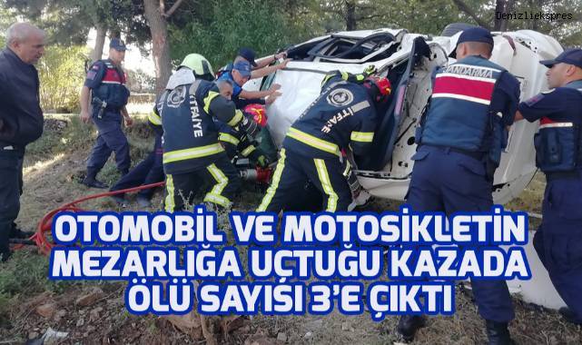 Denizli'nin Tavas ilçesinde kontrolden çıkan otomobilin, motosiklete çarptıktan sonra mezarlığa uçması sonucu meydana gelen kazada ölü sayısı 3’e yükseldi.