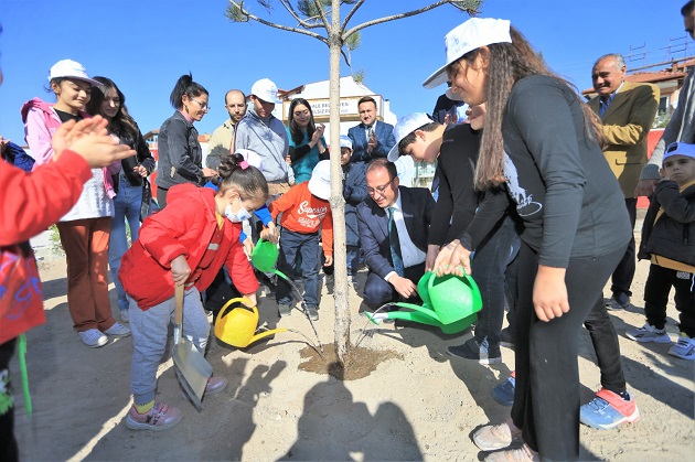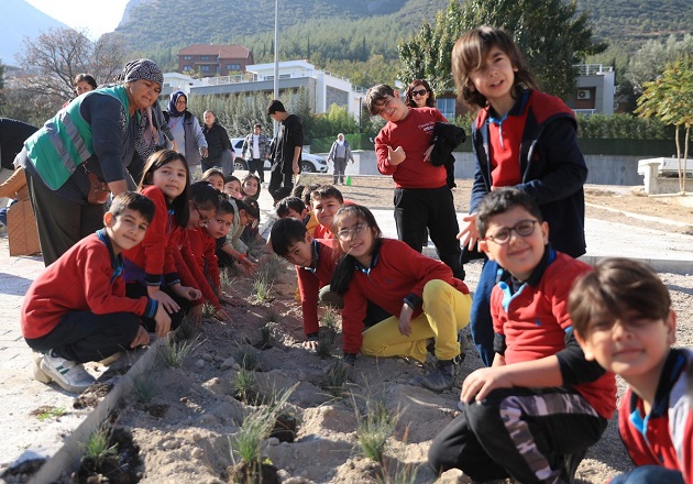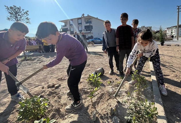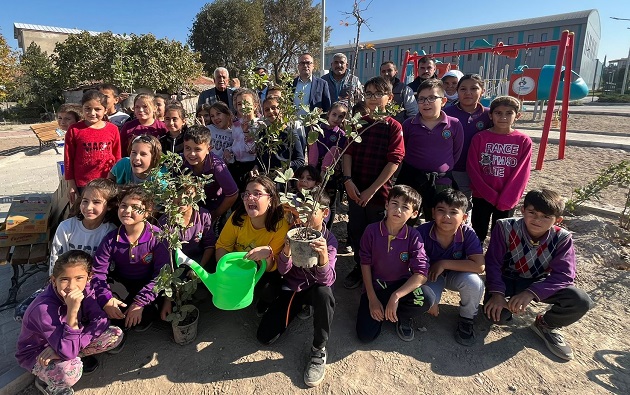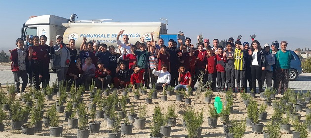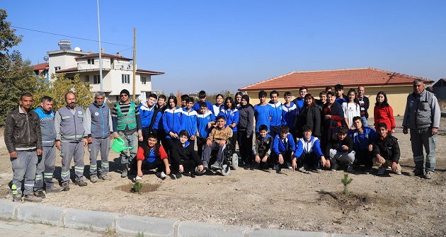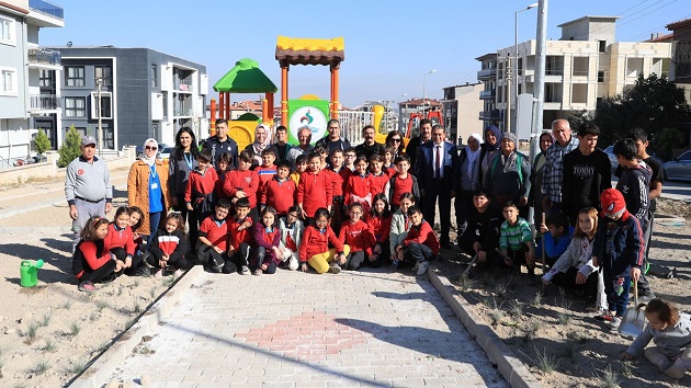 Başkan Örki, öğrencilerle birlikte fidanları toprakla buluşturup can suyu verdi.