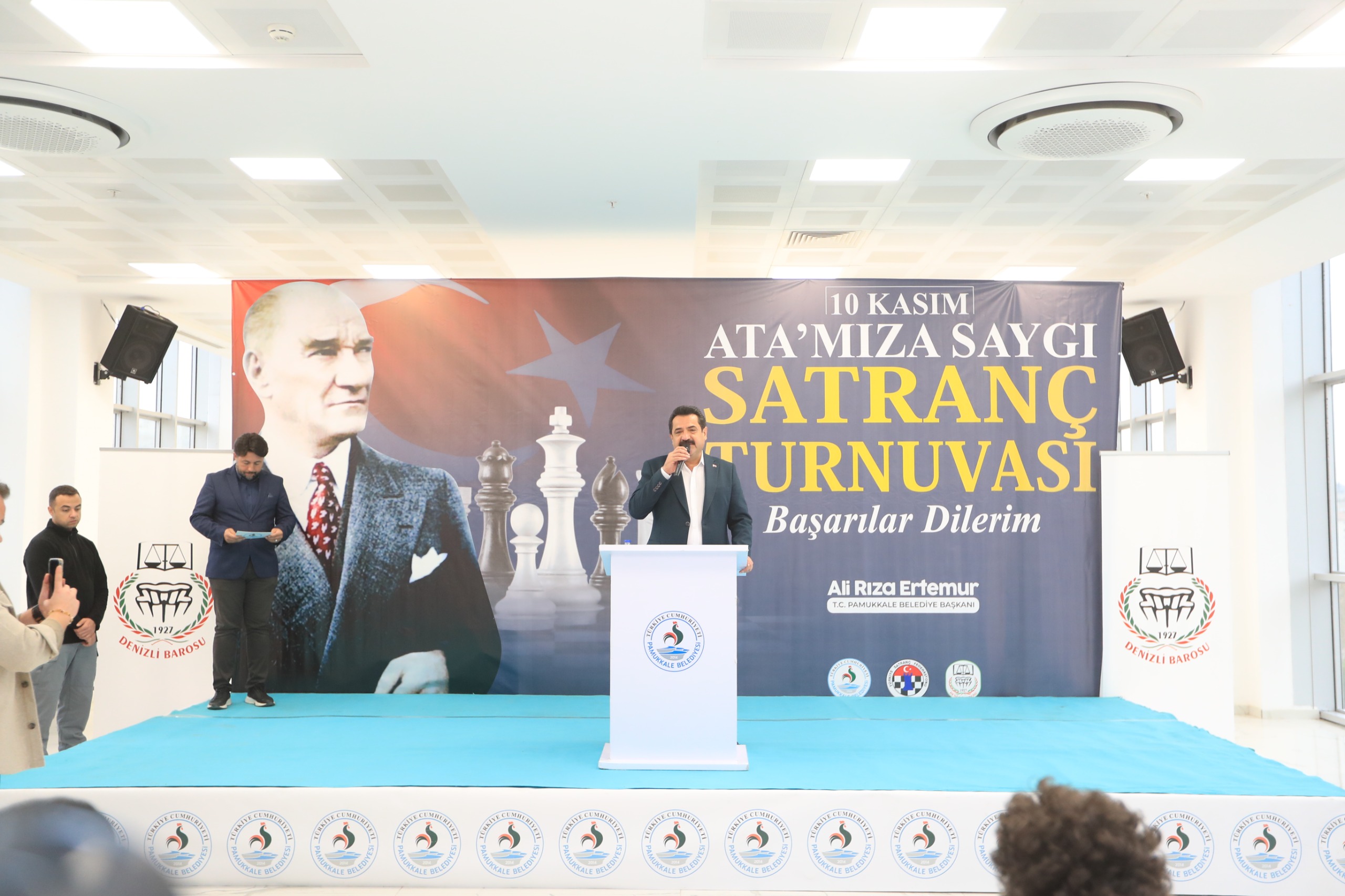 Denizli Büyükşehir Belediye Başkanı Bülent Nuri Çavuşoğlu ise konuşmasında, “Bugün bizler buradaysak, bizler Türk toplumu içerisinde barış, huzur ve birlikte yaşayabiliyorsak, kadınıyla erkeğiyle hep beraber gülebiliyorsak, eğlenebiliyorsak, gençlerimiz geleceğe umutla bakabiliyorsa ve bizler çıktığımız topraklarımızda belediye başkanı, cumhurbaşkanı olabiliyorsak bunun bir tek kahramanı var. O kahramanın adı da Gazi Mustafa Kemal Atatürk’tür. Bu güzel etkinlik için Pamukkale Belediye Başkanı Ali Rıza Ertemur’a ve baro başkanıma teşekkür ediyorum. Ben de satranç oyuncusu bir evladın babasıyım. Satranç benim hayatımda da var. Satranç gerçekten çok keyifli bir spor. Hepinize başarılar diliyorum” dedi. Konuşmaların ardından protokol üyeleri turnuvanın başlangıcını yaptı. Pamukkale Belediye Başkanı Ali Rıza Ertemur, Denizli Baro Başkanı Ufuk Kök ile bir süre satranç oynadı. 20 ilden 300’e yakın lisanslı sporcunun katıldığı turnuvada dereceye giren isimler 12 Kasım 2024 Salı günü belli olacak.