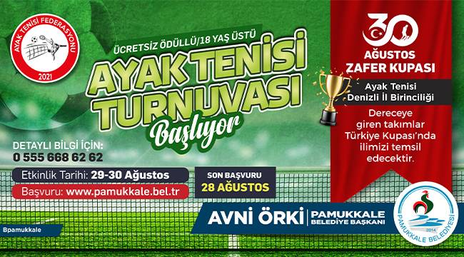 ÖRKİ; “GENÇLERİMİZİN SPORLA İLGİLENMESİ ÖNEMLİ”Pamukkale Belediye Başkanı Avni Örki, gençlerin spora yönlendirilmesine her zaman destek vereceklerini ifade ederek, “Ayak Tenisi ülkemizde resmi olarak yeni başlayan spor branşlarımızdan biri. Mart 2021’de Türkiye Ayak Tenisi Federasyonu’nun kurulmasının ardından Denizli İl Temsilciliğimizle görüşmelerimiz oldu. Gençlerimizin bu eğlenceli spor dalına ilgisinin artması amacıyla, Pamukkale Belediyesi olarak 15 Temmuz Şehitlerini Anma Ayak Tenisi Turnuvası’nda verdiğimiz desteğin devamı niteliğinde 30 Ağustos Zafer Kupası Ayak Tenisi Turnuvası’nda da desteğimizi sürdürüyoruz. Ayrıca, iki gün sürecek turnuva sonunda, dereceye giren takımlarımız Türkiye Kupası’nda ilimizi temsil etme hakkına sahip olacaklar. Gençlerimizin sporla ilgilenmesi önemli. Amacımız, gençlerimizin olumsuz alışkanlardan kaçınarak sporun herhangi bir dalıyla ilgilenerek, sosyal yaşantılarına güzellikler katması. Turnuvaya katılacak takımlarımıza şimdiden başarılar diliyorum” diye konuştu.