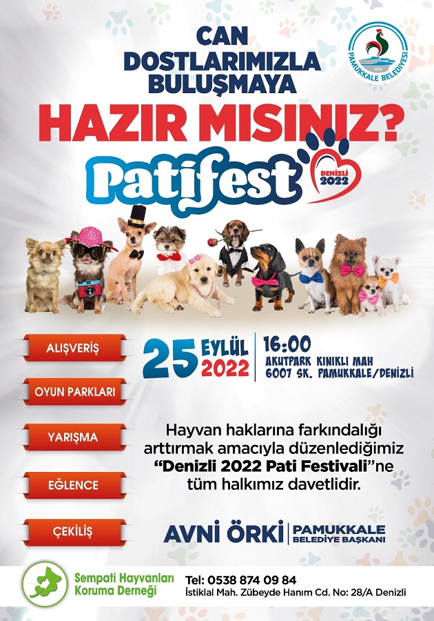 Sosyal farkındalık çalışmalarına önem veren Pamukkale Belediyesi, bu amaçla başlattığı etkinliği festivale dönüştürdü. Bu yıl üçüncüsü düzenlenecek olan ve Denizli’de hayvan dostlarının heyecanla beklediği “Denizli Patifest 2022” 25 Eylül 2022 Pazar günü Akutpark’ta gerçekleşecek.
