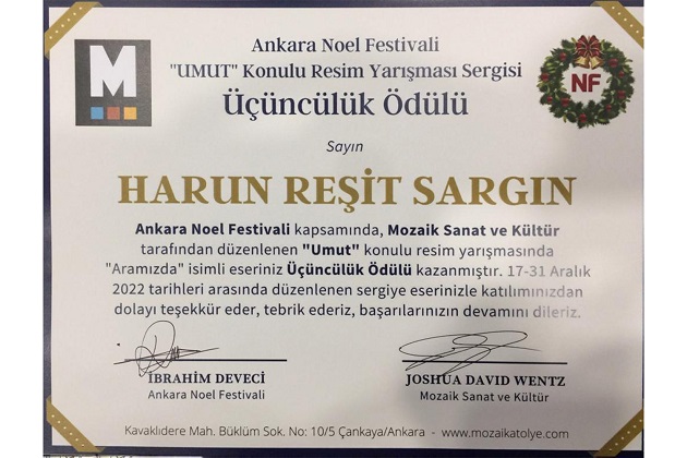 Pamukkale Üniversitesi (PAÜ) Eğitim Bilimleri Enstitüsü Güzel Sanatlar Eğitimi Ana Bilim Dalı Resim - İş Eğitimi Bilim Dalı Tezli Yüksek Lisans Öğrencisi Harun Reşit Sargın, Ankara Uluslararası Noel Festivali adına "UMUT" temalı ödüllü resim yarışmasında "Aramızda" adlı eseriyle 3’üncülük ödülüne layık görüldü.