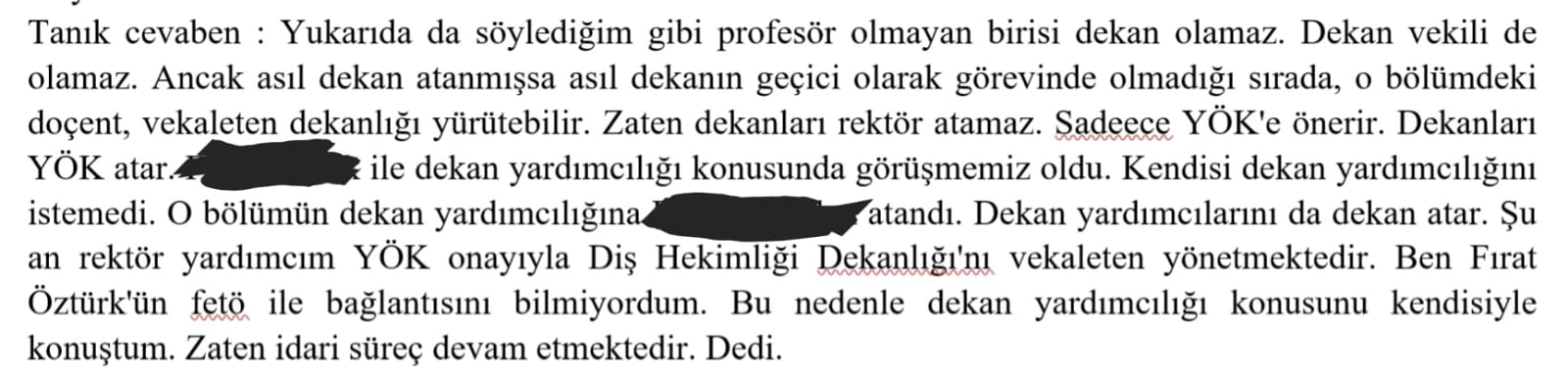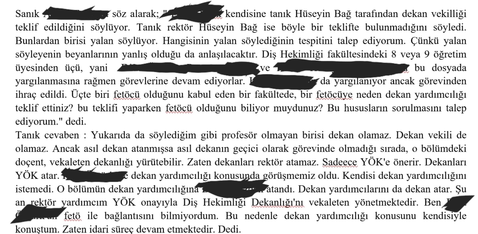 48 sanığın beraatiyle sonuçlanan PAÜ FETÖ/PDY yapılanması davasıyla ilgili Pamukkale Üniversitesi Rektörü Prof. Dr. Hüseyin Bağ da 24 Ağustos 2017 tarihinde mahkemede tanık olarak ifade vermişti.Bağ’ın mahkeme huzurunda verdiği ifadesinde ilginç detaylar dikkat çekmektedir.Bilindiği gibi mahkeme huzurunda ifade veren kişiler aşağıdaki yemini etmektedirler. Bağ da bu yemini etmiştir. “Bana sorulan sorular hakkında gerçeğe uygun cevap vereceğime ve hiçbir şey saklamayacağıma namusum, şerefim ve kutsal saydığım bütün inanç ve değerlerim üzerine yemin ediyorum”Yukarıdaki yemini eden Bağ’a mahkeme huzurunda şu soru soruluyor:Bir kısım sanık müdafii Av. Mehmet Altıntaş tanığa; F. Ö.’e savcılık beyanından hemen önce dekanlık teklif ettiniz mi? F. Ö. daha önce bu örgüt içerisinde olduğunu beyan etti. Buna rağmen neden halen kendisini görevden almadınız?Bağ bu soruya şu şekilde cevap veriyor:Tanık cevaben: F. Ö. doçent olduğu için dekan olması mümkün değildir. Bu nedenle böyle bir teklifte bulunmadım. Dekan vekilliği teklifinde de bulunmadım. F. Ö. görevine halen devam etmektedir. Üniversitede rektörlük görevim sebebiyle yürütmekte olduğum fetö soruşturmalarıyla ilgili bilgi vermek istemiyorum.Bağ F. Ö.’yü görevden almadığını itiraf ediyor ve F. Ö. doçent olduğu için dekan olması mümkün değildir. Diyor.Ancak F.Ö. de mahkeme huzurunda yemin ederek verdiği ifadesinde kendine Bağ tarafından dekan yardımcılığı teklif edildiğini beyan ediyor.İşte F.Ö.’nün o ifadeleri:“Dekan vekilliği teklifi olmadı. Rektör Hüseyin Bağ beni Dekan yardımcılığı görevine getirmeyi düşündüğünü söyledi. Ben de bunun uygun olmayacağını söyledim ve kabul etmedim. Çünkü bu süreçte çocuklarım FETÖ’nün okullarına gitmişti. Sohbetlerine katılmıştım.” Aslında F.Ö. soruyu düzeltiyor ve dekanlık değil dekan yardımcılığı teklif edildiğini beyan ediyor. Rektör Bağ ise yine idari görev olan dekan yardımcılığı teklif ettiğini bildiği halde mahkeme heyetinden bunu gizliyor ve “ F. Ö. doçent olduğu için dekan olması mümkün değildir.” diyor.Mahkemeye heyeti dahil tüm katılanların akademik şargonu tam olarak bilmesi mümkün değildir. aslında soru çok net (mahkeme sonucunda, FETÖ üyesi olmaktan ceza alan) “daha önce bu örgüt içerisinde olduğunu beyan eden kişiye bir görev teklif ettiniz mi?” ancak Rektör Bağ böyle bir teklif ettiğini mahkeme heyetinden gizliyor.Bu durum mahkemede hazır bulunanlar tarafından fark ediliyor ve aynı soru tekrar soruluyor:İşte mahkeme tutanaklarındaki o sözler:Sanık A. T. söz alarak; "F. Ö. kendisine tanık Hüseyin Bağ tarafından dekan vekilliği teklif edildiğini söylüyor. Tanık rektör Hüseyin Bağ ise böyle bir teklifte bulunmadığını söyledi. Bunlardan birisi yalan söylüyor. Hangisinin yalan söylediğinin tespitini talep ediyorum. Çünkü yalan söyleyenin beyanlarının yanlış olduğu da anlaşılacaktır. Diş Hekimliği fakültesindeki 8 veya 9 öğretim üyesinden üçü, yani F. Ö., R. K. ve H. H. K. bu dosyada yargılanmasına rağmen görevlerine devam ediyorlar. H. B. da yargılanıyor ancak görevinden ihraç edildi. Üçte biri fetöcü olduğunu kabul eden bir fakültede, bir fetöcüye neden dekan yardımcılığı teklif ettiniz?Rektör Bağ yine bu teklifi gizlemeye çalışsa da sonunda itiraf etmek zorunda kalıyor.İşte Rektör Bağ’ın mahkeme tutanaklarındaki o sözleri:Tanık cevaben : Yukarıda da söylediğim gibi profesör olmayan birisi dekan olamaz. Dekan vekili de olamaz. Ancak asıl dekan atanmışsa asıl dekanın geçici olarak görevinde olmadığı sırada, o bölümdeki doçent, vekaleten dekanlığı yürütebilir. Zaten dekanları rektör atamaz. Sadece YÖK'e önerir. Dekanları YÖK atar. Fırat Öztürk ile dekan yardımcılığı konusunda görüşmemiz oldu. Kendisi dekan yardımcılığını istemedi. O bölümün dekan yardımcılığına B. Y. atandı. Dekan yardımcılarını da dekan atar. Şu an rektör yardımcım YÖK onayıyla Diş Hekimliği Dekanlığı'nı vekaleten yönetmektedir. Ben F.Ö’nün fetö ile bağlantısını bilmiyordum. Bu nedenle dekan yardımcılığı konusunu kendisiyle konuştum.Daha önce F. Ö.’ye idari bir görev teklif etmediğini gizleyen Rektör Bağ, sonunda itiraf etmek zorunda kalıyor.Ancak ifadesinde yine çok dikkat çekici bir ifade daha bulunmaktadır. F. Ö.’nün “çocuklarım FETÖ’nün okullarına gitmişti. Sohbetlerine katılmıştım, Bankalarına para yatırdım, medya aboneliği için para verdim.” İtiraflarına rağmen “Ben FETÖ ile mücadele etmek için görevlendirildim” diyen bir rektör, devletin tüm bilgi, belgeleri, banka, dernek kayıtları, istihbarat verileri elinde olmasına rağmen;Mahkeme heyetine hiç de inandırıcı olmayan şekilde “Ben F.Ö’nün fetö ile bağlantısını bilmiyordum.” Diyor.Tüm bu bilgileri ve Bağ’ın ettiği yemine sadık kalıp kalmadığı, gerçek dışı beyanda bulunup bulunmadığı, bir şeyler saklayıp saklamadığı hususlarını kamuoyunun bilgisine sunuyor ve yorumlarına bırakıyoruz.