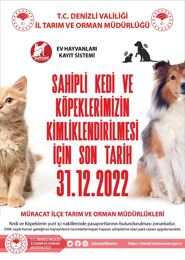 Kedi ve köpek sahiplerinin, 31 Aralık 2022 tarihine kadar İl/İlçe Tarım ve Orman Müdürlüklerine başvurması halinde her yaştaki sahipli kedi ve köpeklerin Ev Hayvanı Kayıt Sistemi’ne (PETVET) kayıt işlemlerinin yapılabileceği bildirildi.