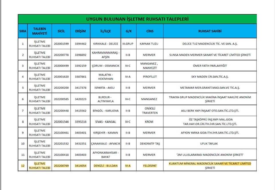 Sait Yalçın'ın sosyal medyadan paylaştığı belgeler, bu iddiaları doğrular nitelikte. Denizli Valiliği Çevre, Şehircilik ve İklim Değişikliği İl Müdürlüğü’nün duyurularına göre, Buldan ilçesi Aktaş Mahallesi’nde Kuantum Mineral Madencilik Sanayi ve Ticaret Limited Şirketi’ne ait feldispat işletme ruhsatı başvurusunun bulunduğu kaydedildi.