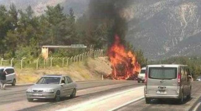 Denizli-Antalya karayolunda seyir halindeyken alev alan saman yüklü kamyon kül oldu. Kamyonun yanma anı seyir halinde olan sürücü tarafından kaydedildi.