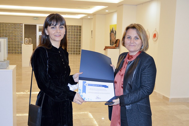 Sergi hakkında bilgi alan ve eserleri yakından inceleyen Eğitim Fakültesi Dekanı Prof. Dr. Bilge Can, katkılarından dolayı Arş. Gör. Dr. Ceren Tekin Karagöz'ü kutlayarak, teşekkür belgesi takdim etti.