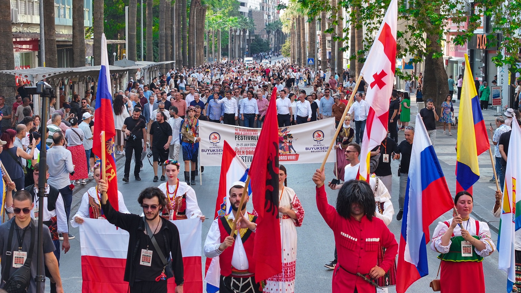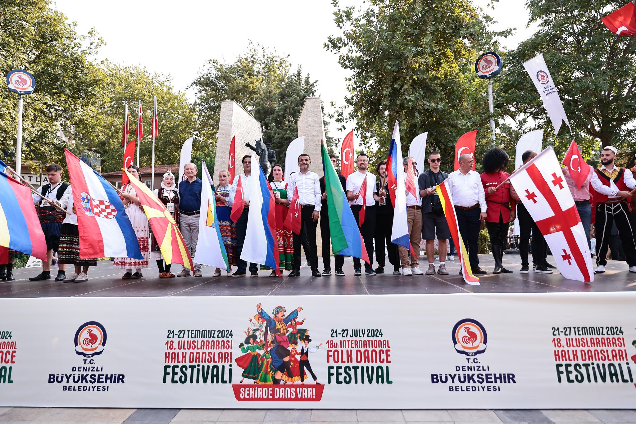 Denizli Büyükşehir Belediyesinin bu yıl 18'incisini düzenlediği Uluslararası Halk Dansları Festivali kortej ile başladı. Kortej öncesi ise Valilik önündeki Atatürk Anıtı’nda çelenk töreni yapıldı. Denizli Valiliği önünden başlayan korteje, Denizli Milletvekili Şeref Arpacı, Denizli Büyükşehir Belediye Başkanı Bülent Nuri Çavuşoğlu, Başkanvekili Ali Marım, CHP Denizli İl Başkanı Ali Osman Horzum, Pamukkale Belediye Başkanı Ali Rıza Ertemur, Merkezefendi Belediye Başkan Yardımcısı Osman Bartal, Büyükşehir Belediyesi Genel Sekreteri Bülent Bozbaş, davetliler ve festivale katılan 12 ayrı ülkenin halk dansı sanatçıları katıldı.
