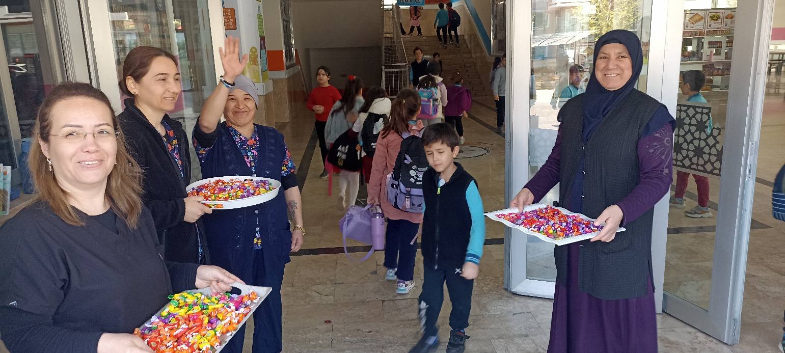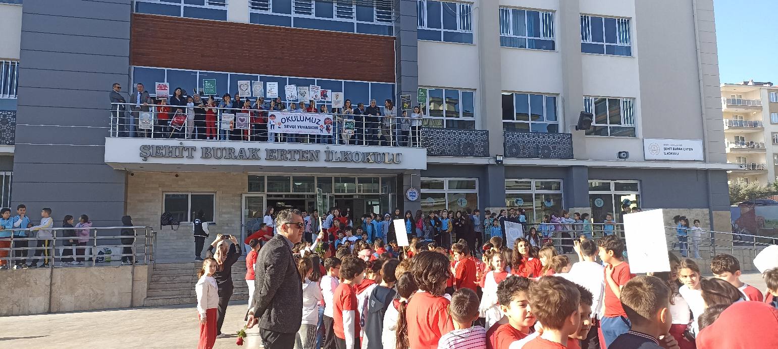 Şehit Burak Erten İlkokulu Müdürü Hasan Akçaöz, sabah erken saatlerde okul girişinde yer alarak öğrenci ve öğretmenleri bizzat karşıladı. Etkinlik kapsamında öğrencilerle birlikte çiçek ve şeker dağıtımı yapıldı.