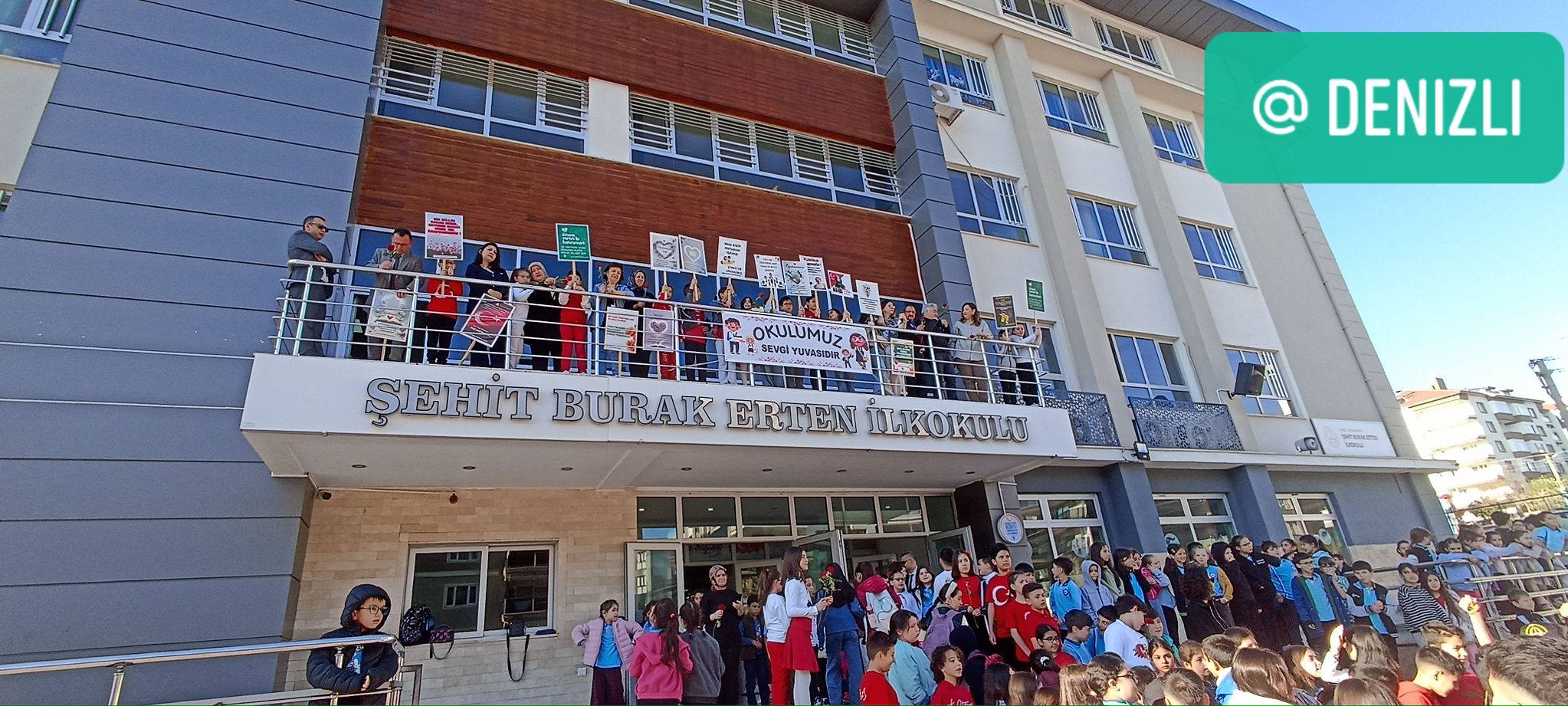 Denizli’de Şehit Burak Erten İlkokulu’nda, son dönemde farklı illerde yaşanan okul saldırılarına dikkat çekmek ve eğitim ortamında güven duygusunu güçlendirmek amacıyla anlamlı bir farkındalık etkinliği gerçekleştirildi.