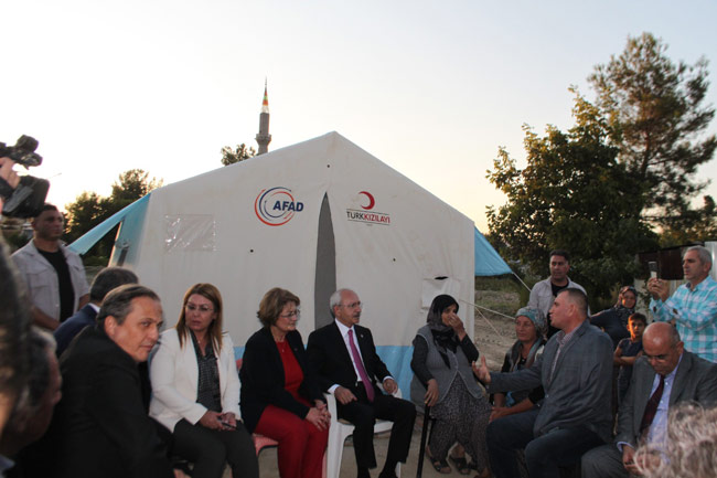 Kılıçdaroğlu, sonrasında ise depremde evi ağır hasar gören ve bu yüzden torunu ve kızı ile evinin bahçesindeki çadırda kalmak zorunda olan 70 yaşındaki Mevlide Doğan’ı ziyaret etti. Ziyarette Kılıçdaroğlu, yaraların sarılacağını ve kısa zaman içinde Doğan’ın evine kavuşacağını söyledi. Ziyaretin ardından kendisini bekleyen gazetecilere açıklamalarda bulunan Kılıçdaroğlu, kış gelmeden önce, oturulamayacak evlerde olan şuanda çadırda yaşayan insanlara prefabrik konut yapılmasında çaba olduğunu kaydetti. Kılıdçaroğlu, “Kısa süre içerisinde daha uzun bir dönemde belediye binasının daha güzel yapılacak, inşallah. Sosyal dayanışmayı burada göstereceğiz, hiç kimse mağdur olmamalı depremde bile olmamalı. Bu ortamı oluşturmaya çalışacağız, bizim siyaset anlayışımızda dayanışma içinde, herhangi bir belediyemiz vatandaş sıkıntıya düştüğü zaman o belediye öncelikle sorunu çözmek için, uğraşacak, eğer kapasitesini aşıyorsa diğer belediyelerimiz yardım edecek ve bu yeni siyaset anlayışımızı yaygınlaşarak sürdüreceğiz” dedi.