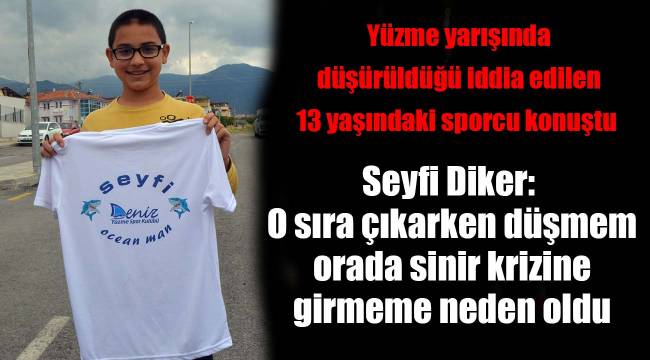 Marmaris’te düzenlenen Uluslararası Aquamasters Yüzme Yarışması finalinde 40 yaşındaki eski milli yüzücü Tolga Öcal’ın yarışı genel klasmanda kendinden önce bitirmek üzere iken iterek düşürdüğü iddia edilen 13 yaşındaki Seyfi Diker, “O sıra çıkarken düşmem orada sinir krizine girmeme neden oldu. Tolga ağabeyi ile konuştuk, özür diledi” dedi.