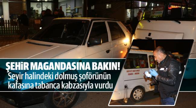 Seyir halindeki dolmuş şoförünün kafasına tabanca kabzasıyla vurdu