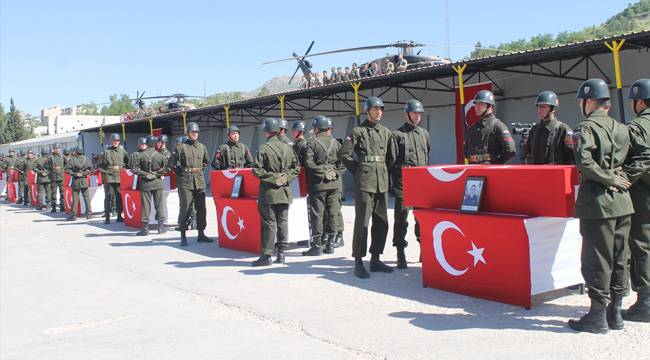 Şırnak/Şenoba'daki helikopter kazasında şehit olan 13 askerden 7'si için, 23. Jandarma Sınır Tümen Komutanlığı'nda tören düzenlendi. 6 askerin cenazeleri ise kimlik tespitleri için Ankara'ya gönderildi.Şenoba Tugay Komutanlığından kalkışından kısa bir süre sonra yüksek gerilim hatlarına takılması sonucu kaza kırıma uğrayan askeri helikopterde şehit olan 13 askerden 7'si için 23. Jandarma Sınır Tümen Komutanlığı'nda tören düzenlendi.Akşam askeri helikopterin düşmesi sonucu şehit olan ve Şırnak Devlet Hastanesine götürülen 13 askerden 23. Jandarma Sınır Tümen Komutanı Tümgeneral Aydoğan Aydın ile Albay Oğuzhan Küçükdemir, Yüzbaşı İlker Acar, Pilot Üsteğmen Abdulmuttalip Kesikbaş, Başçavuş Fevzi Kıral ve Uzman Çavuş Hakan İncekar'ın cenazeleri otopsi için Ankara Adli Tıp Kurumuna gönderildi.Şırnak'taki hastanede otopsisi tamamlanan Kurmay Albay Gökhan Peker, Jandarma Yüzbaşı Songül Yakut, İstihbarat Binbaşı Koray Onay, Piyade Yüzbaşı Nuri Şener, Kurmay Pilot Yüzbaşı Serhat Sığnak, Astsubay Kıdemli Başçavuş Mehmet Erdoğan, Uzman Çavuş Zeki Koç için 23. Sınır Tümen Komutanlığında tören düzenlendi.Törene, Başbakan Yardımcısı Mehmet Şimşek, Milli Savunma Bakanı Fikri Işık, İçişleri Bakanı Süleyman Soylu, Genelkurmay Başkanı Orgeneral Hulusi Akar, Kara Kuvvetleri Komutanı Orgeneral Salih Zeki Çolak, Deniz Kuvvetleri Komutanı Oramiral Bülent Bostanoğlu, Hava Kuvvetleri Komutanı Orgeneral Abidin Ünal, Şırnak Valisi Ali İhsan Su, Siirt Valisi Mustafa Tutulmaz, Çakırsöğüt Jandarma Komando Tugay Komutanı Tuğgeneral Ercan Yaşin, İl Jandarma Komutanı Albay Hünkar Keleş, İl Emniyet Müdürü Ömer Uslusoy ve şehit yakınları katıldı.Törende şehitlerin Türk bayrağına sarılı naaşları katafalka konuldu, öz geçmişlerinin okunmasının ardından Şırnak Müftüsü Ramazan Tolan tarafından dua edildi.Şırnak kahramanlarını dualarla son yolculuğuna uğurladıBu sırada şehitlerin yakınları ile silah arkadaşları gözyaşlarına hakim olamadı.Törenin ardından Yüzbaşı Yakut'un cenazesi Malatya'ya, Yüzbaşı Sığnak'ın cenazesi Adana'ya, Uzman Çavuş Koç'un cenazesi Osmaniye'ye, Astsubay Erdoğan'ın cenazesi Kayseri'ye, Albay Peker ve Yüzbaşı Şener'in naaşları İstanbul'a, Binbaşı Onay'ın naaşı ise Çanakkale'ye gönderilmek üzere helikopterlerle Şırnak Şerafettin Elçi Havalimanına götürüldü.Başbakan Yardımcısı Şimşek, Milli Savunma Bakanı Işık, İçişleri Bakanı Soylu, Genelkurmay Başkanı Orgeneral Akar ile kuvvet komutanları şehitlerin yakınları ile görüşerek başsağlığı diledi.KATO'YU TEMİZLEYEN EKİPHelikopterin içesinde bulanan 23. Sınır Tümen Komutanı Tümgeneral Aydoğan Aydın, Albay Oğuzhan Küçükdemir, Albay Gökhan Peker, Yarbay Songül Yakut, Binbaşı Koray Onay, Yüzbaşı İlker Acar, Yüzbaşı Nuri Şener, Pilot Yüzbaşı Serhat Sığınak, Pilot Üsteğmen Aldülmüttalip Kesikbaş, Başçavuş Mehmet Erdoğan, Teknik Başçavuş Fevzi Kıral, Uzman Çavuş Zeki Koç ve Piyade Uzman Çavuş Hakan İncekal şehit oldu. Helikopterde bulunan komutanların Kato Dağı'nda 100 yakın mağaranın yerle bir edildiği terörle mücadele operasyonlarının yöneten ekipti.