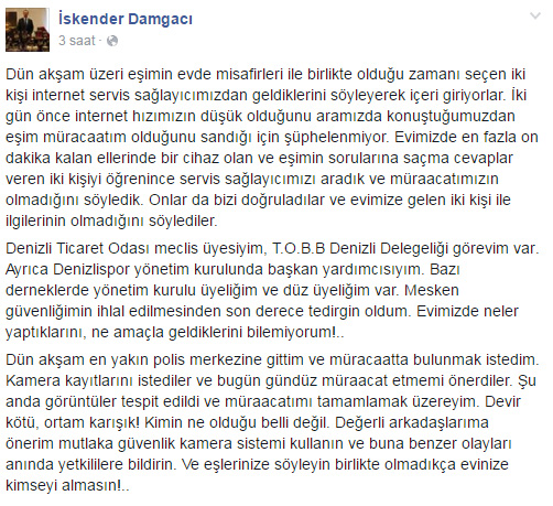 İskender Damgacı, sosyal paylaşım sitesi facebook hesabı üzerinden yaptığı paylaşımda Denizli halkının bu konuda dikkatli olmasını isterken “dün akşamüzeri eşimin evde misafirleri ile birlikte olduğu zamanı seçen iki kişi internet servis sağlayıcımızdan geldiklerini söyleyerek içeri giriyorlar. İki gün önce internet hızımızın düşük olduğunu aramızda konuştuğumuzdan eşim müracaatım olduğunu sandığı için şüphelenmiyor. Evimizde en fazla on dakika kalan ellerinde bir cihaz olan ve eşimin sorularına saçma cevaplar veren iki kişiyi öğrenince servis sağlayıcımızı aradık ve müracaatımızın olmadığını söyledik. Onlar da bizi doğruladılar ve evimize gelen iki kişi ile ilgilerinin olmadığını söylediler.Denizli Ticaret Odası meclis üyesiyim, T.O.B.B Denizli Delegeliği görevim var. Ayrıca Denizlispor yönetim kurulunda başkan yardımcısıyım. Bazı derneklerde yönetim kurulu üyeliğim ve düz üyeliğim var. Mesken güvenliğimin ihlal edilmesinden son derece tedirgin oldum. Evimizde neler yaptıklarını, ne amaçla geldiklerini bilemiyorum!Dün akşam en yakın polis merkezine gittim ve müracaatta bulunmak istedim. Kamera kayıtlarını istediler ve bugün gündüz müracaat etmemi önerdiler. Şu anda görüntüler tespit edildi ve müracaatımı tamamlamak üzereyim. Devir kötü, ortam karışık! Kimin ne olduğu belli değil. Değerli arkadaşlarıma önerim mutlaka güvenlik kamera sistemi kullanın ve buna benzer olayları anında yetkililere bildirin. Ve eşlerinize söyleyin birlikte olmadıkça evinize kimseyi almasın!” sözlerini dile getirdi.
