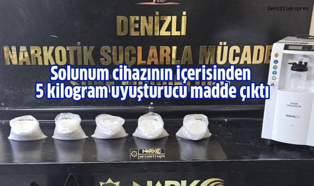 Denizli Emniyet Müdürlüğüne bağlı Narkotik Suçlarla Mücadele Şube Müdürlüğü ekipleri aldıkları istihbarat bilgileri doğrultusunda bir şahsın kente uyuşturucu madde getireceği bilgisine ulaştı. Narkotik timleri tarafından takibe alına şüpheli kadın, üzerinde ve eşyalarında yapılan aramalarda ise uyuşturucu maddelerin saklandığı yer pes dedirtti. Narkotik madde arama köpeğinin aramalar sırasında solunum cihazına tepki vermesi tüm dikkati o yöne çekti. Ekipleri kutusundan çıkarttığı solunum cihazının içine 5 kilogram metamfetamin gizlendiği belirlendi. Zehir taciri şüpheli kadın ise gözaltına alındı. Emniyetteki işlemlerinin ardından şüpheli çıkarıldığı mahkemece tutuklandı.