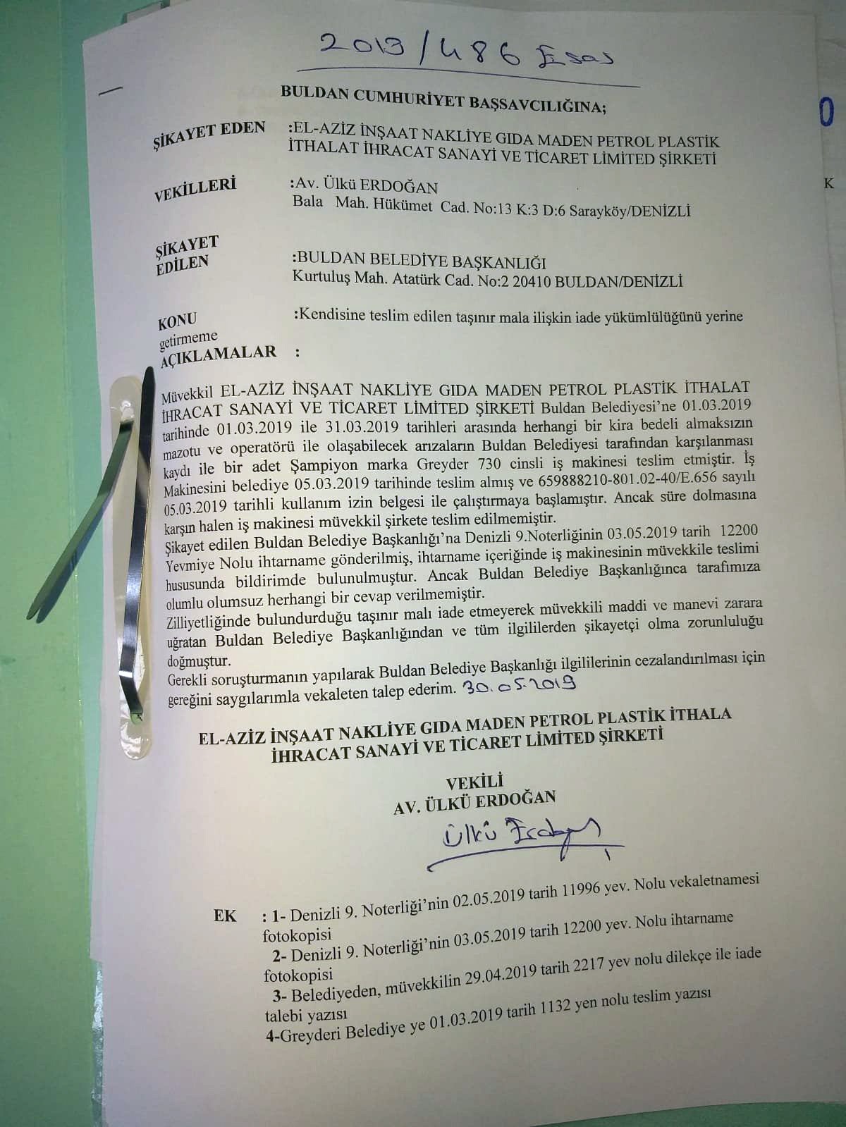 Buldan Belediyesi'nden edinilen bilgiye göre, olayın kendileri ile ilgili olmadığını kaydederek, "Bu olay bizden önceki başkanı ilgilendiren bir konu bizi ilgilendiren bir konu değil. Bizim elimizde ne dozer ne de greyder var" dendi.
