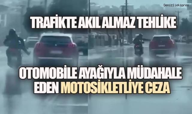 Denizli’de trafikte tehlikeli anlara neden olan bir motosiklet sürücüsü, sosyal medyaya yansıyan görüntüler sonrası tespit edilerek cezalandırıldı. Seyir halindeki bir otomobile ayağıyla müdahale ettiği görülen sürücünün hareketi, trafik güvenliğini ciddi şekilde riske attı.