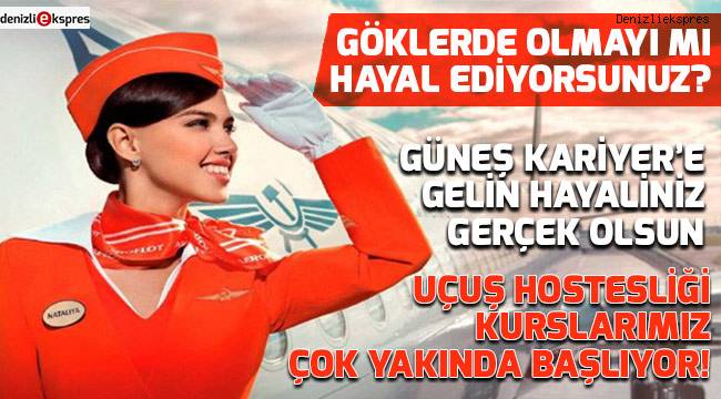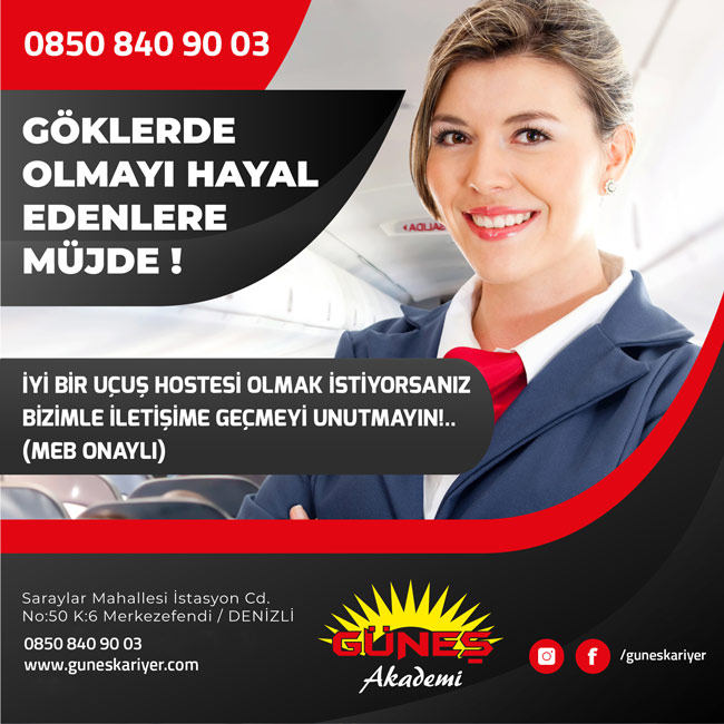 İYİ BİR UÇUŞ HOSTESİ OLMANIN YOLU GÜNEŞ KARİYERDEN GEÇERGüneş Kariyer, yıllardan bu yana Denizli halkının güvenini kazanmış, Denizli halkına hizmet eden Güneş Sürücü Kursu’nun yan kuruluşudur. Karayolu trafiğinde marka olmuş Güneş sürücü kursu şimdi de Güneş Kariyer olarak, Göklerde olmayı hayal edenlere hizmet vermek için çok yakında açacağı kurslarla, hayallerinizi gerçekleştirecektir. Güneş Kariyer’in sahiplerinden Cengiz Varol, açacakları kabin memurluğu kurslarıyla ilgili olarak, yıllarca karayolu trafiğinde kendilerini kanıtladıklarını, şimdi de göklerde olmak isteyenlerin hayallerini gerçekleştirmek istediklerini söyledi. Cengiz Varol, iyi bir uçuş hostesi olmanın yolu; yolcuya saygı, kapsamlı eğitim ve bireysel disiplinden geçtiğini belirterek, “Bu meslekte görev alan uçuş hosteslerinin başlıca görevleri; uçakta şirket temsilcisi olarak müşteri memnuniyeti bilinciyle ev sahipliği yapmak, yerde ve uçuşta yolcuyla ilgili emniyet tedbirlerini almaktır. Tehlike ve acil durumda yolcunun uçaktan tahliyesini gerçekleştirmektir. Uçuş hosteslerinin diğer bir görevi de yolcuların konforlu bir şekilde seyahat etmelerini sağlamaktır. Kurum olarak hem teorik hem de uygulamalı olarak verdiğimiz eğitimlerle kişileri uçuşa hazır ve görev bilinci gelişmiş olarak yetiştiriyoruz” diye konuştu.