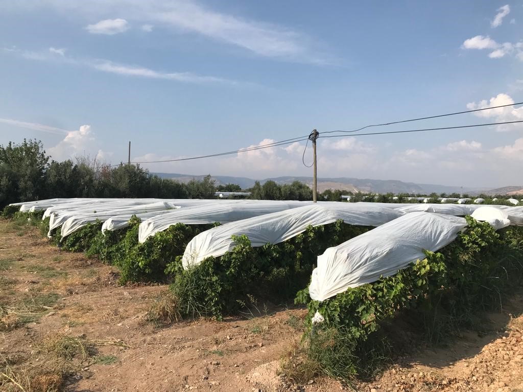 Değişken hava şartları nedeniyle yüzlerce kilo çöp olan çekirdeksiz üzüm için üreticiler ilginç bir koruma yöntemi geliştirdi. Bağlar üstüne beyaz branda örtü seren üretici, bu sayede hem aşırı sıcaklarda güneşten hem de yağmurdan mahsulü korudu.