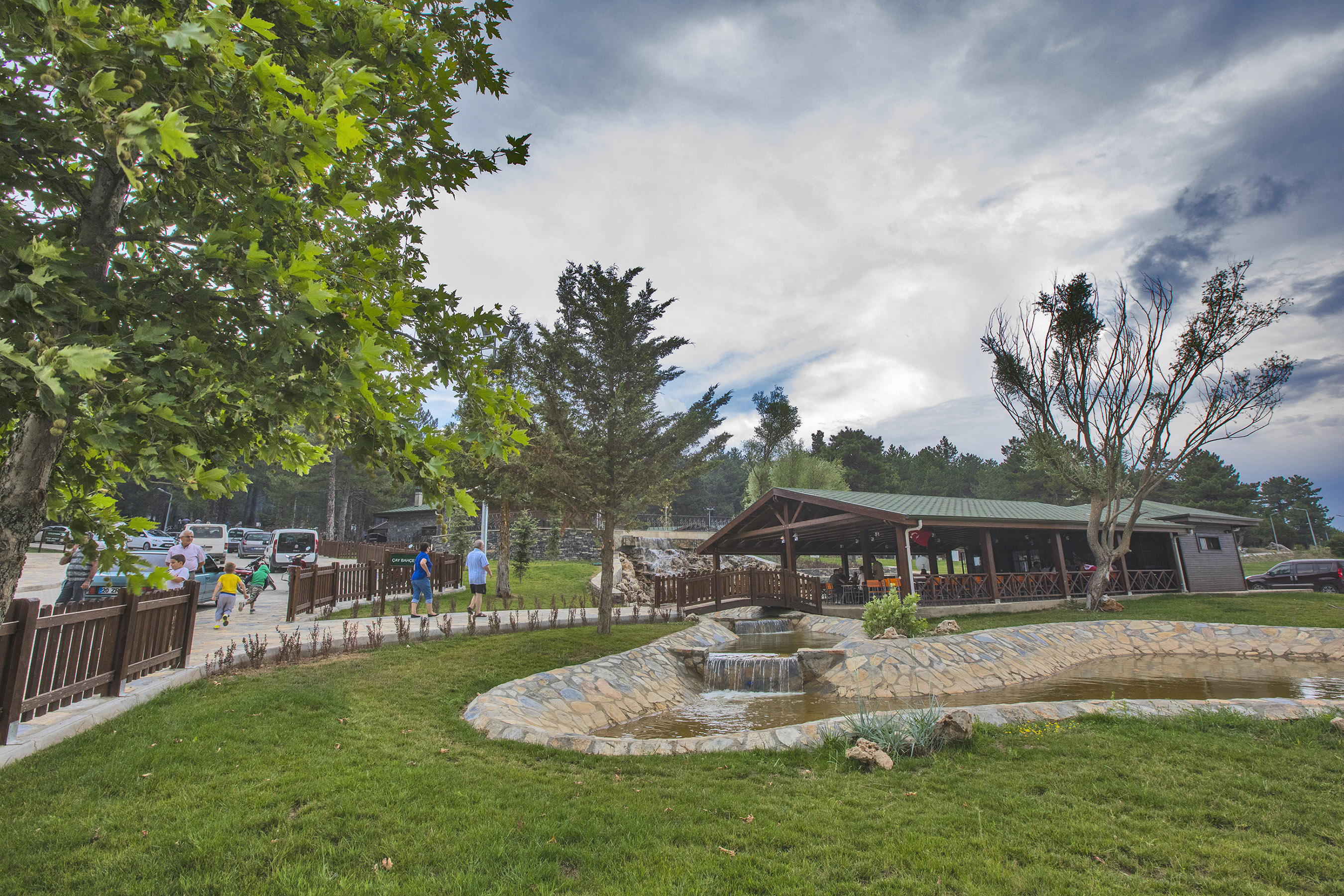 alan içerisinde restoran, büfe, manav, çay bahçesi, spor alanı, oyun alanları, 24
